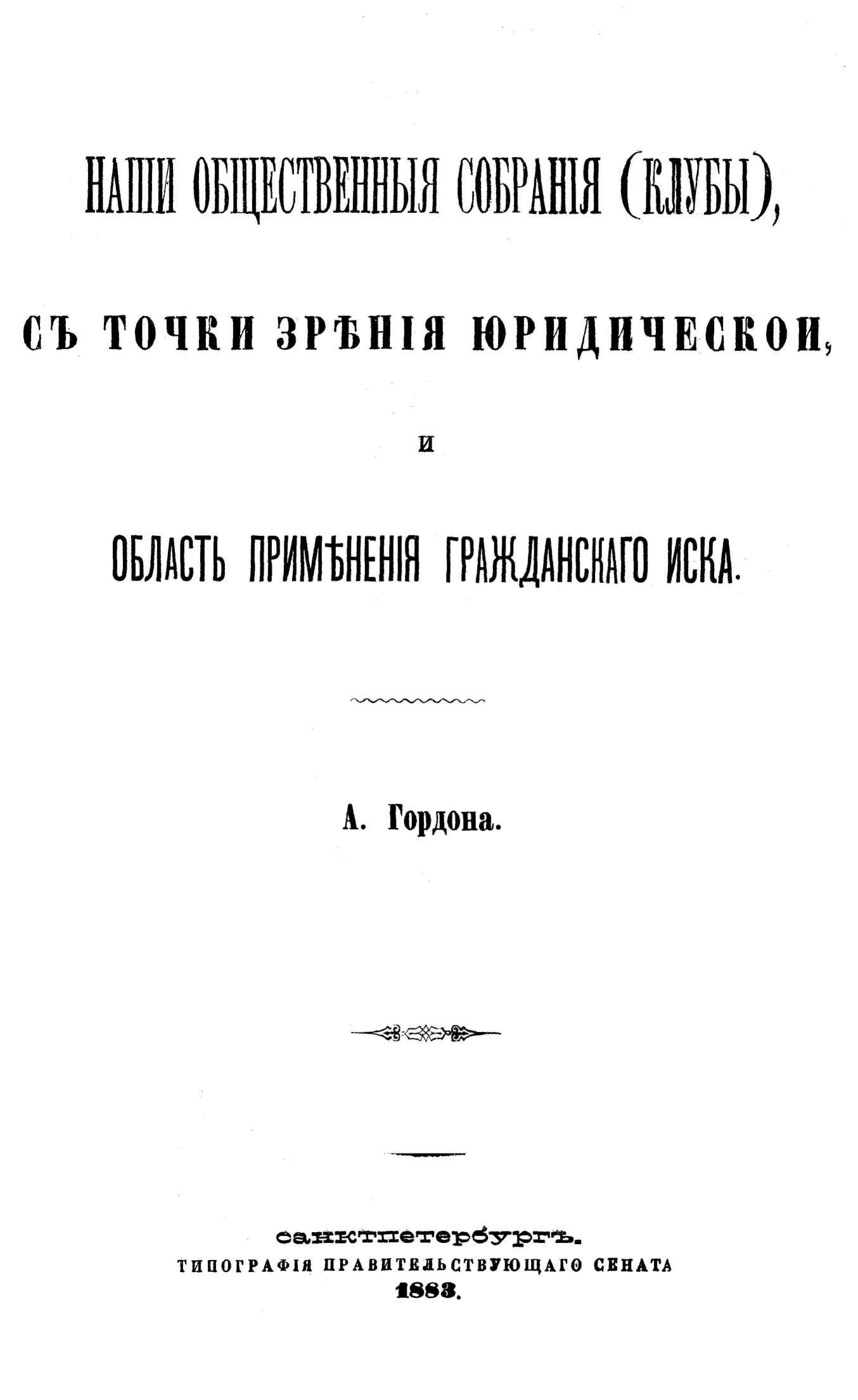 Наши общественные собрания (клубы), с точки зрения юридической , и область применения гражданского иска / Гордон А. - С.-Пб.: Тип. Правительствующего Сената, 1883. - 57 c. – формат B5 – репринтная копия