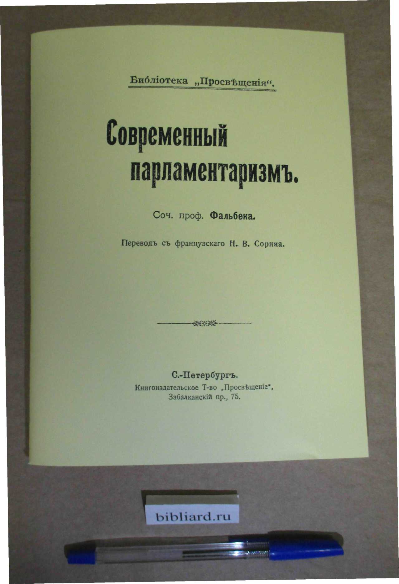 Современный парламентаризм. Перевод с французского / Фальбек; Пер.: Сорин Н.В. - С.-Пб.: Книгоизд. Т-во "Просвещение", 1907. - 120 с. - формат B5 - репринтная копия