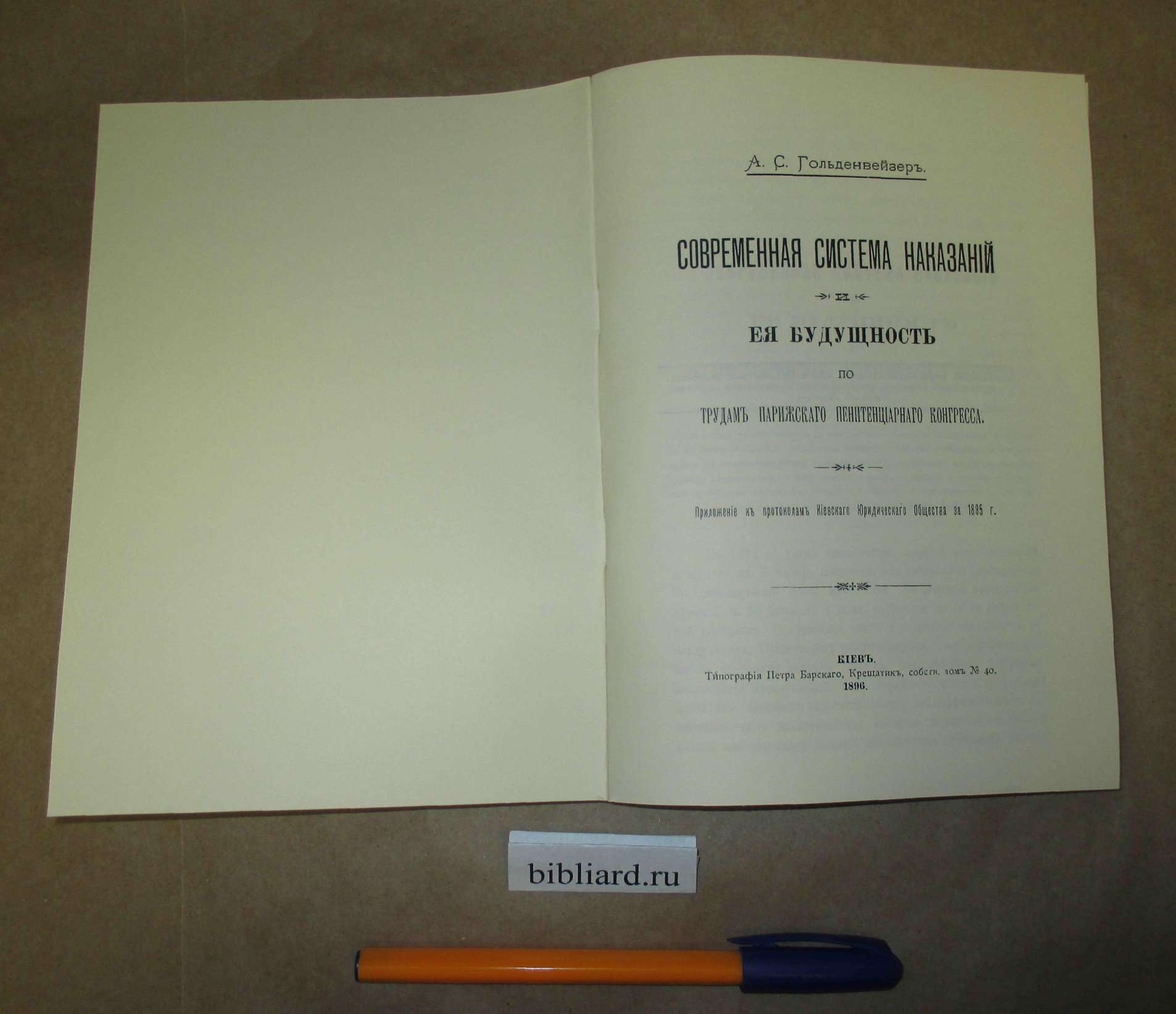 Современная система наказаний и ее будущность по трудам парижского пенитенциарного конгресса: Приложение к протоколам Киевского Юридического Общества за 1895 г. / Гольденвейзер А.С. – Киев: Тип. П. Барского, 1896. – 136 с. - формат А5 - репринтная копия