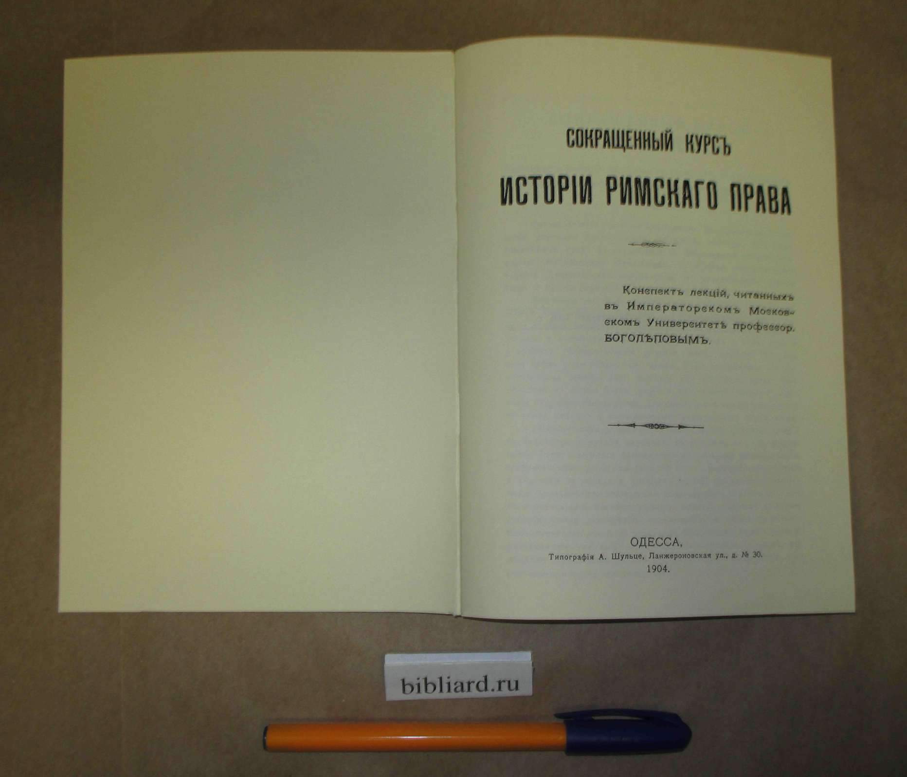 - Сокращенный курс истории римского права: Конспект лекций / Боголепов Н., проф. – Одесса: Тип. А. Шульце, 1904. – 148 с. - репринтная копия