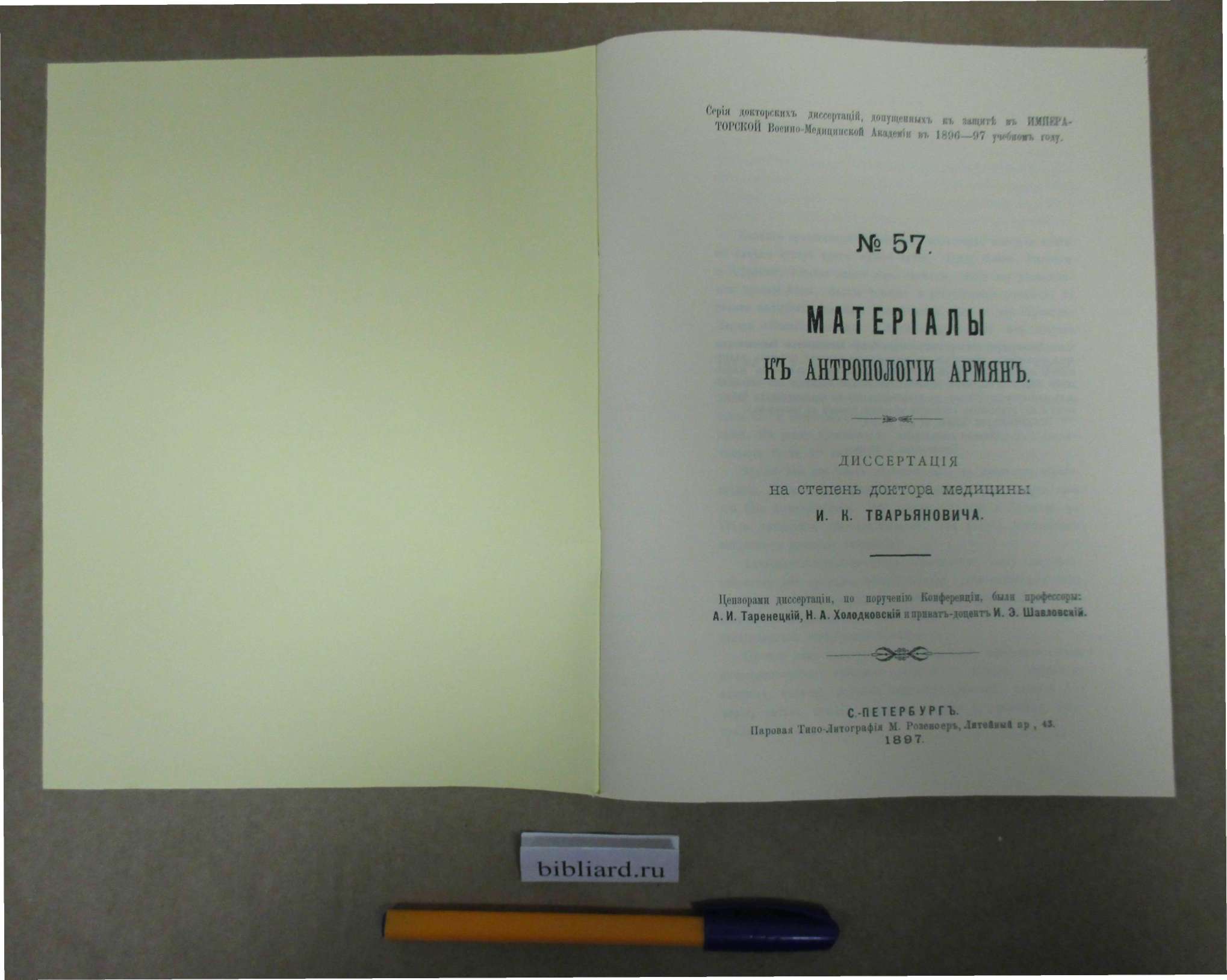 Материалы к антропологии армян: Диссертация на степень доктора медицины / Тварьянович И.К. – С.-Пб.: Паровая типо-лит. М. Розеноер, 1897. – 160 с. - формат В5 – репринтная копия