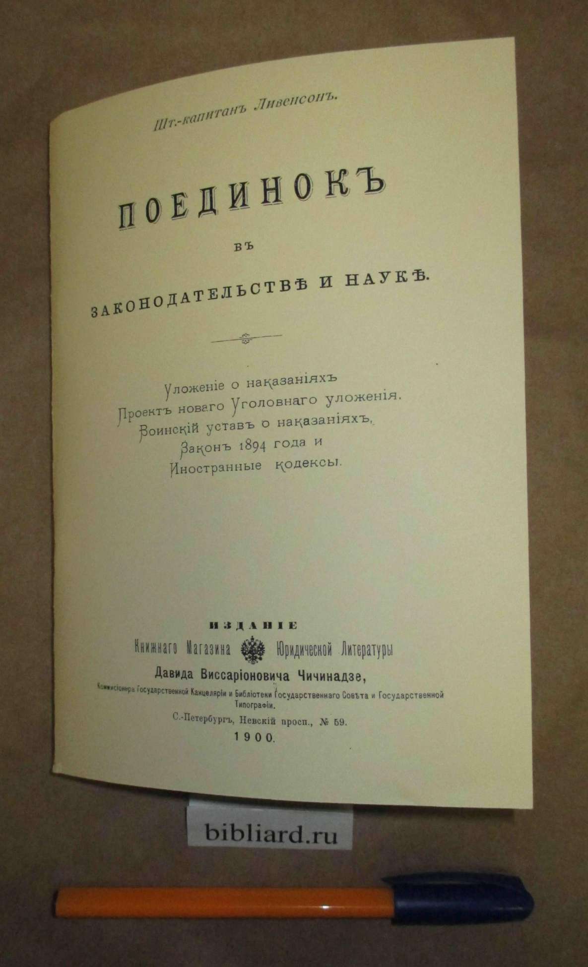 - Поединок в законодательстве и науке. Уложение о наказаниях. Проект нового уголовного уложения. Воинский устав о наказаниях. Закон 1894 года и иностранные кодексы / Ливенсон, Шт.-кап. – С.-Пб.: Д.В. Чичинадзе, 1900. – 143 c. – репринтная копия