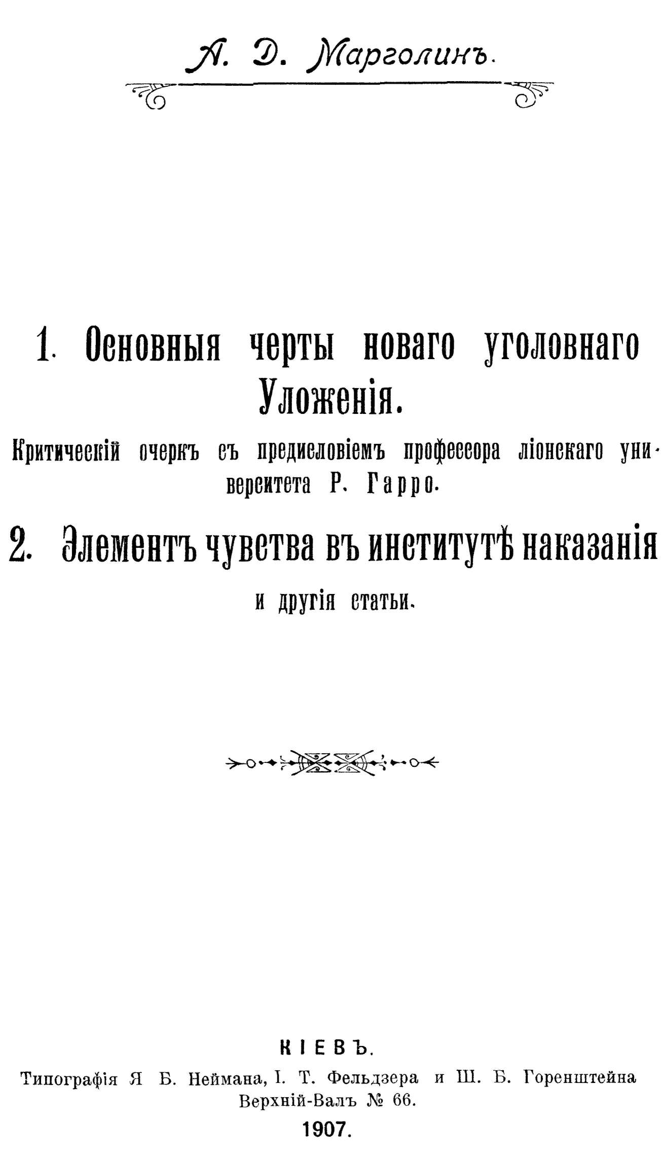 Из области уголовного права. Основные черты нового Уголовного Уложения. Элемент чувства в институте наказания и другие статьи / Марголин А.Д.; Предисл.: Гарро Р. - Киев: Тип. Я.Б. Неймана, И.Т. Фельдзера и Ш.Б. Горенштейна, 1907. - 127 с. - формат В5 - репринтная копия