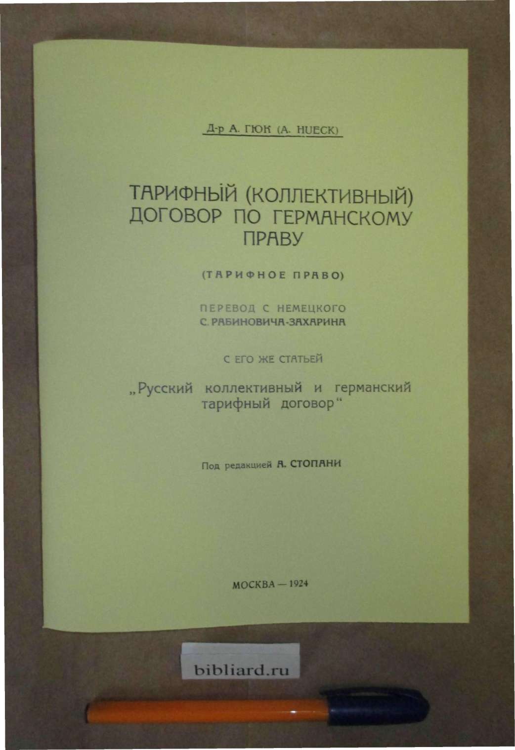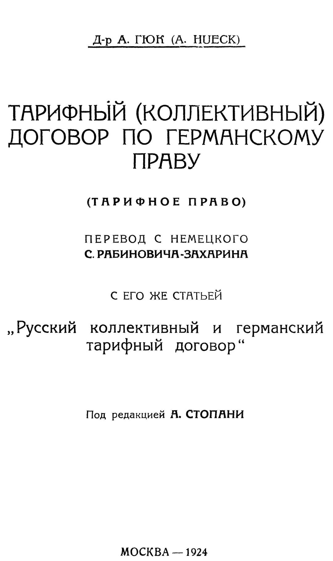Тарифный (коллективный) договор по германскому праву. Тарифное право: Перевод с немецкого / Гюк А.; Под ред.: Стопани А.; Пер.: Рабинович-Захарин С. - М., 1924. - 104 с. - формат В5 - репринтная копия