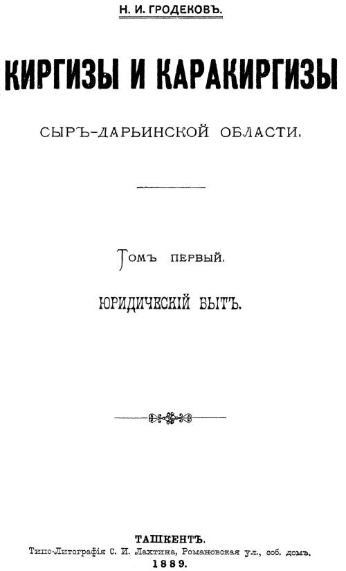 Киргизы и каракиргизы Сыр-Дарьинской области. Юридический быт. Т. 1 / Гродеков Н.И. – Ташкент: Типо-лит. С.И. Лахтина, 1889. – 544 с. – репринтная копия