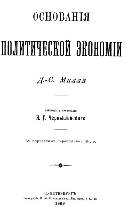 Основания политической экономии. С портретом переводчика 1859 г. / Милль Д.С.; Чернышевский Н.Г. – С.-Пб.: Тип. М.М. Стасюлевича, 1909. – 676 c. – репринтная копия