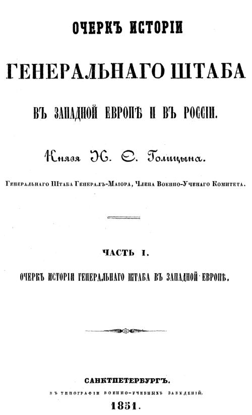 Очерк истории Генерального штаба в Западной Европе и в России. Ч. 1: Очерк истории Генерального штаба в Западной Европе / Голицын Н.С., кн., Ген. штаба ген.-майор, чл. Воен.-учен. ком. – Спб.: Тип. Воен.-учеб. заведений, 1851. – 273 с. – репринтная копия