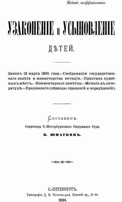 Узаконение и усыновление детей: Закон 12 марта 1891 года. Соображения государственного и министерства юстиции. Практика судебных мест. Комментарные заметки. Мнения в литературе. Приложения (образцы прошений и определений) / Сост.: К. Шматков, секр. С.-Петерб. окр. суда. – С.-Пб.: Тип. Д.В. Чичинадзе, 1894. – 200 с. - репринтная копия