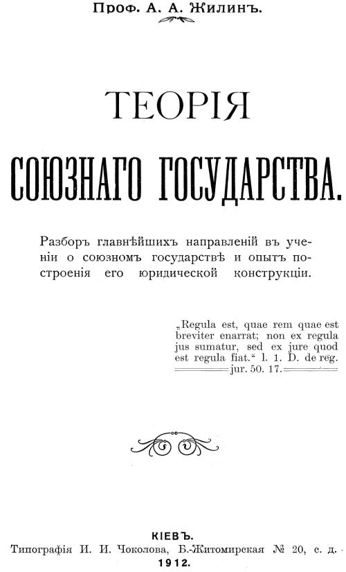 Теория союзного государства: Разбор главнейших направлений в учении о союзном государстве и опыт построения его юридической конструкции / Жилин А.А., проф. – Киев: Тип. И.И. Чоколова, 1912. – 360 с. – репринтная копия
